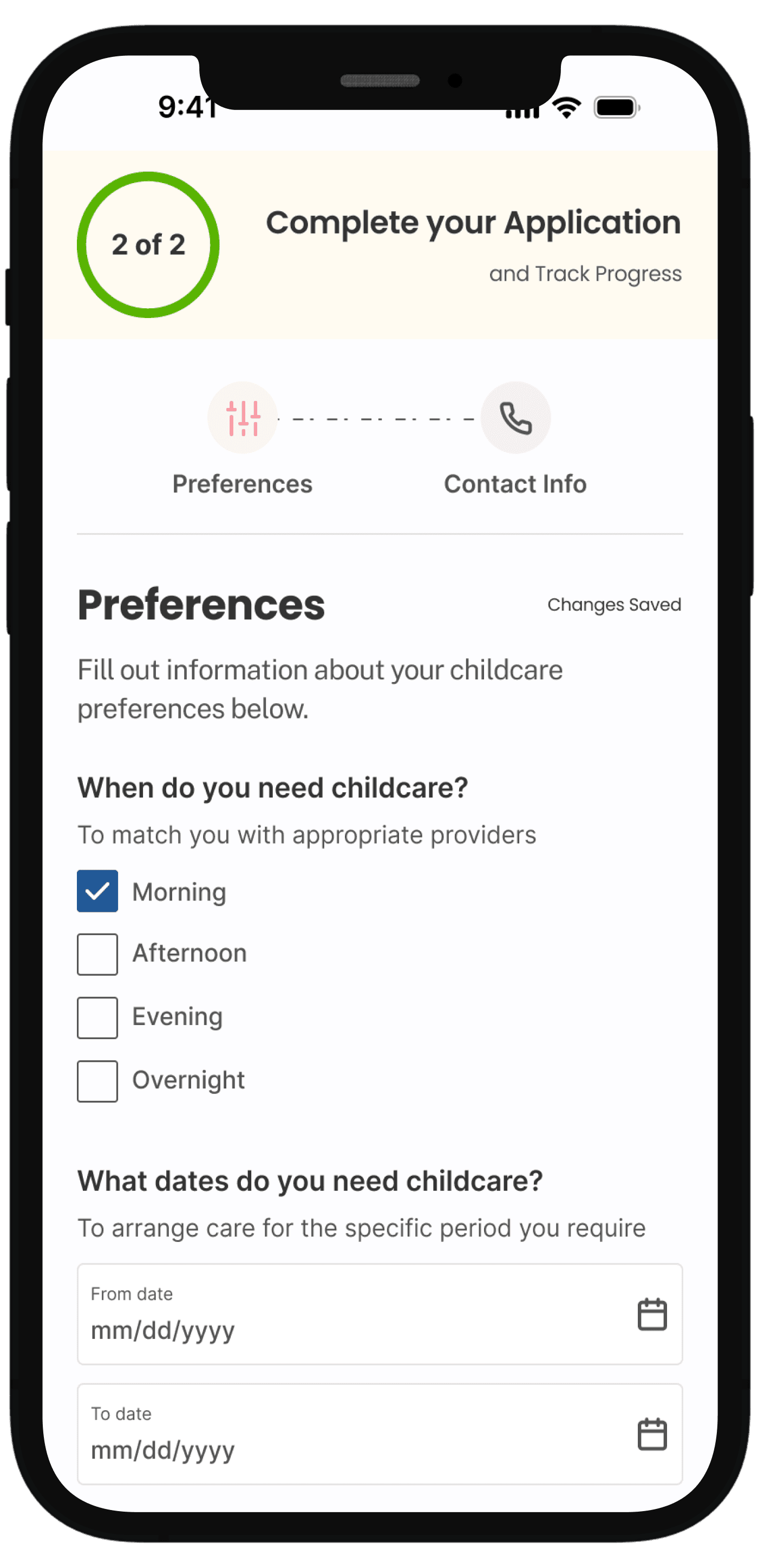 Added circular progress indicator (2 of 2) at the top of each screen showing completion status, with tab navigation between sections (Preferences and Contact Info).